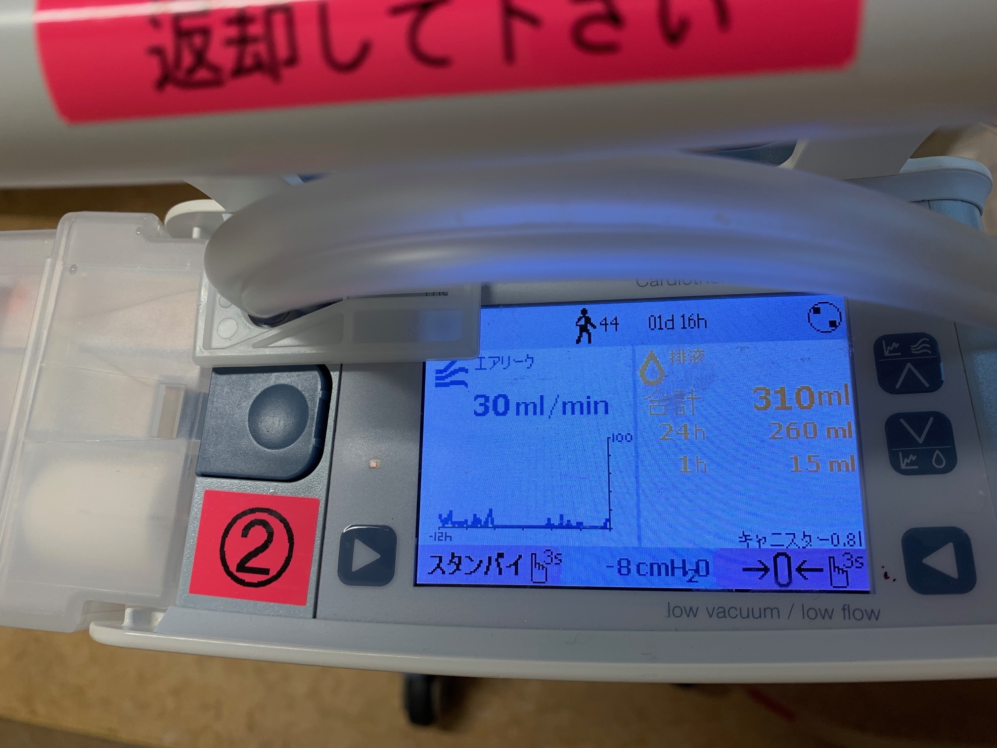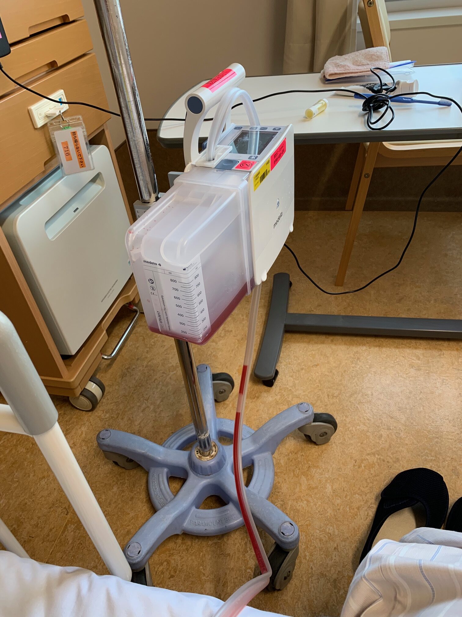 執刀医の先生から、トパーズが示すリーク量が、毎分10ml以下が8時間連続で続いたら抜きごろ。と伺っていて、昨日は見るたびに60とか150とかだったのでしょぼん(´・ω・`) としていました。執刀医の先生には、わたしの左上葉と下葉がきっちり分かれていなくて、切ってから下葉を縫ったのでそれは仕方ない。と言われていました。この日は見ると0とか10なことが増えました。