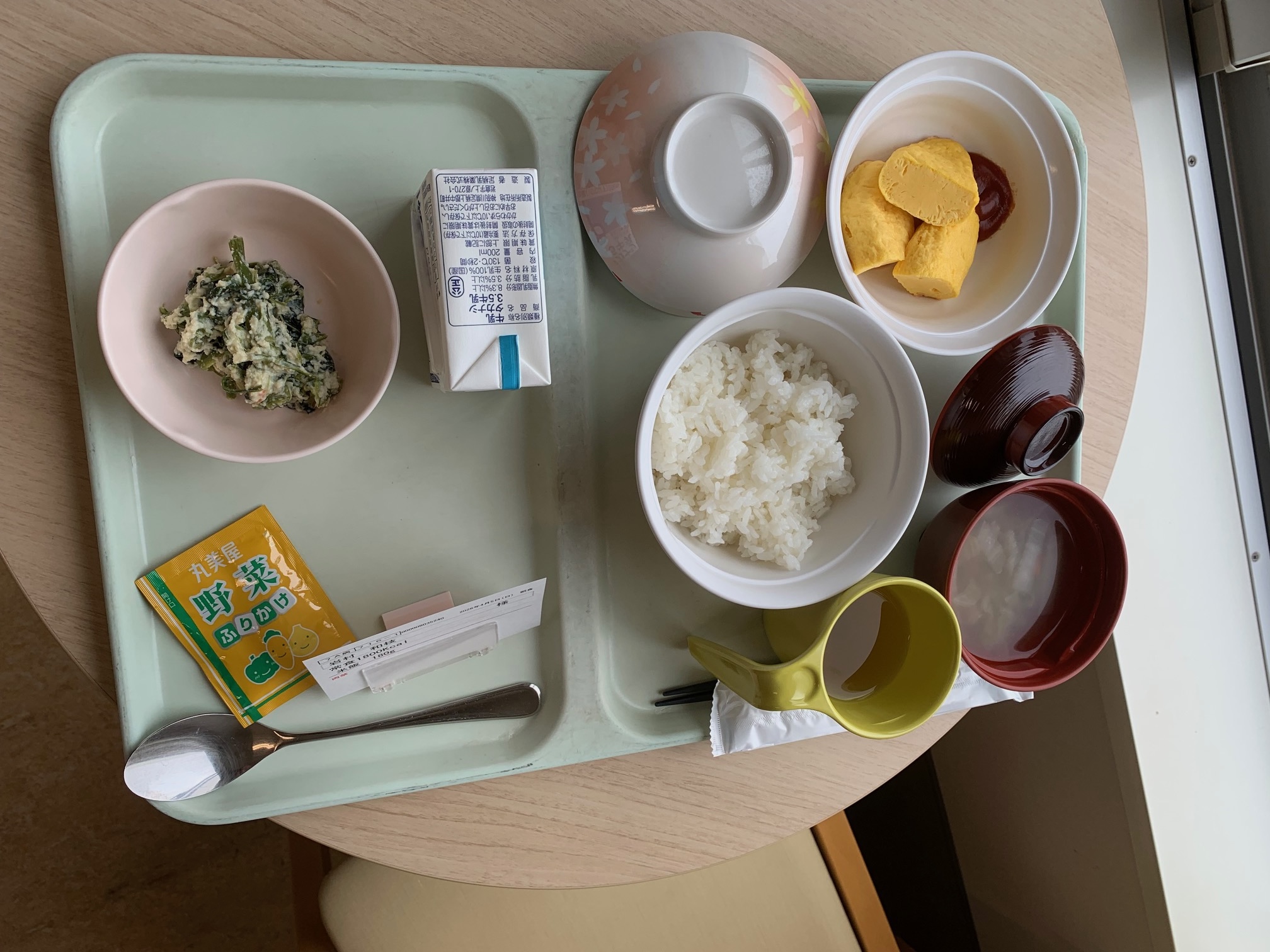 胸部レントゲンを撮ってから、11時に呼吸器外科病棟に戻りました。レントゲンの際の息どめが、ものすごく辛く苦しくなっていた事に術後を実感しました。LUL (left upper lobe、左上葉ちゃんですね)の存在の大きさを思い知ったと言いますか。戻ったのは前と同じ部屋でした。ネギ畑ビューです。でも窓を開けているとヒバリや鶯の囀る声が聞こえて、のほほんとした気分になります。