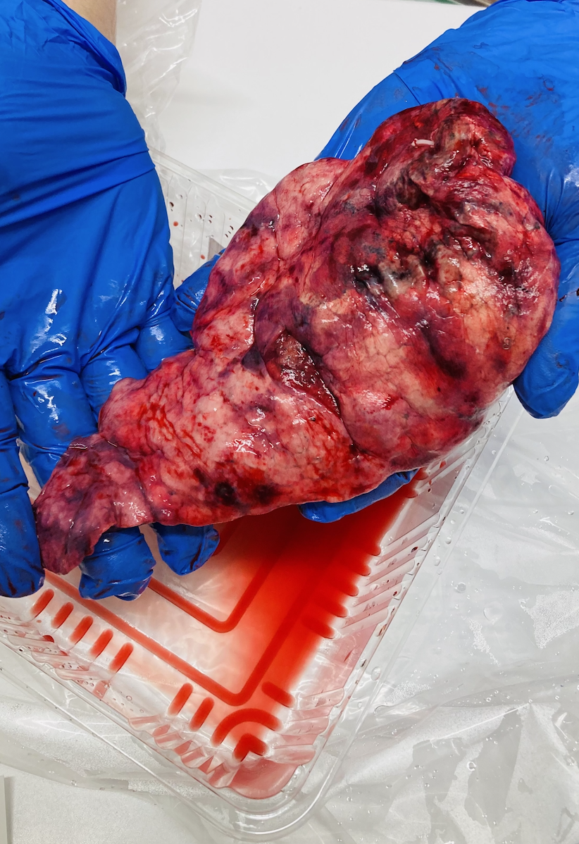 (その晩の姉からのメールによると、家族待合室で待っていて、13時35分に執刀医の先生がわたしの左上葉を手に現れて、手袋をくれて持たせてくれて癌の部分も触らせてくれたとのことでした。姉も2度手術歴があり、自身の検体を見たがったそうですが本人なので見せてもらえず、悔しがっていました。病理写真のような写真も撮らせていただき、とてもサービス満点な病院だなと思いました。少しだけ2度の肺炎歴のせいか癒着があり、また、正常変異で上葉と下葉がきっちりと分かれておらず、くっついた上葉と下葉をメスで切り分けて、下葉も縫う羽目になったため少し時間がかかったとのことでした。手にした感じでは350gくらい?とのことでした。)