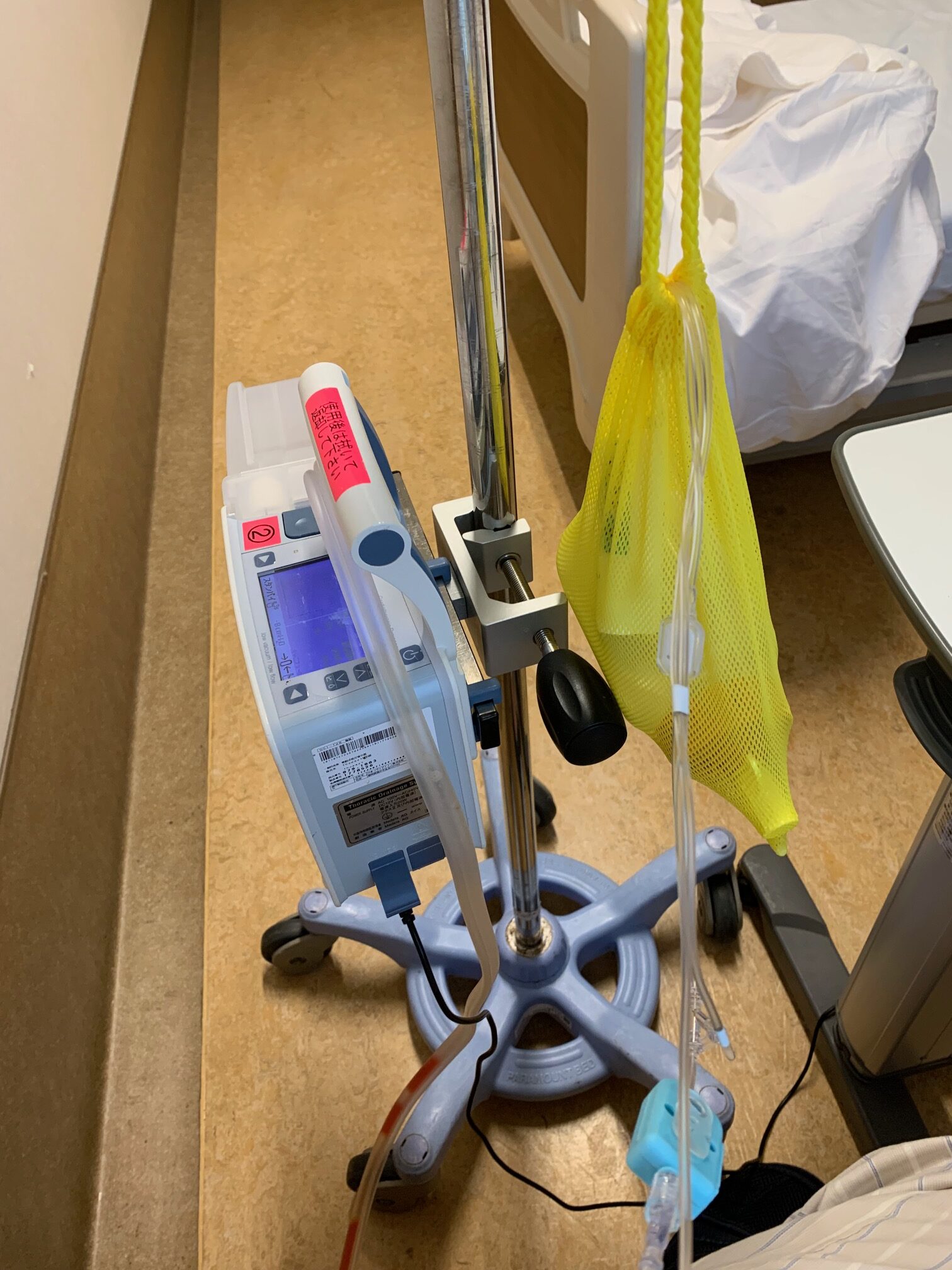 美味しそうでしたが、姉が美味しい美味しい、根津の谷の弁当を差し入れるから少なめにして待て。というのでご飯は1割くらいしか食べないようにして、美味しそうでしたが牛乳かん?杏仁豆腐?風なデザートも残しました。そして午前中にレントゲン後、3周したら汗をかきましたが午後のお昼後にまた3周歩いたら汗はかきませんでした。1階のレントゲン室まで行くのもそこそこ負荷なんでしょうかね?そして今日になってやっと気虚をちょっと脱したというか、「やる気」と「元気」が戻ってきました。ベッドからの起き上がりも、まだまだ上肢の力に頼ってはいますが前日よりは格段に楽になりましたし、傷の痛みもリークも減ってきました。ドレーン内の血液+浸出液の色も薄まって、赤から朱色になってきました。黄色い網網の袋に入ってるのは硬膜外麻酔ですね。パイナップルちゃんと呼んでいました。地味に邪魔。